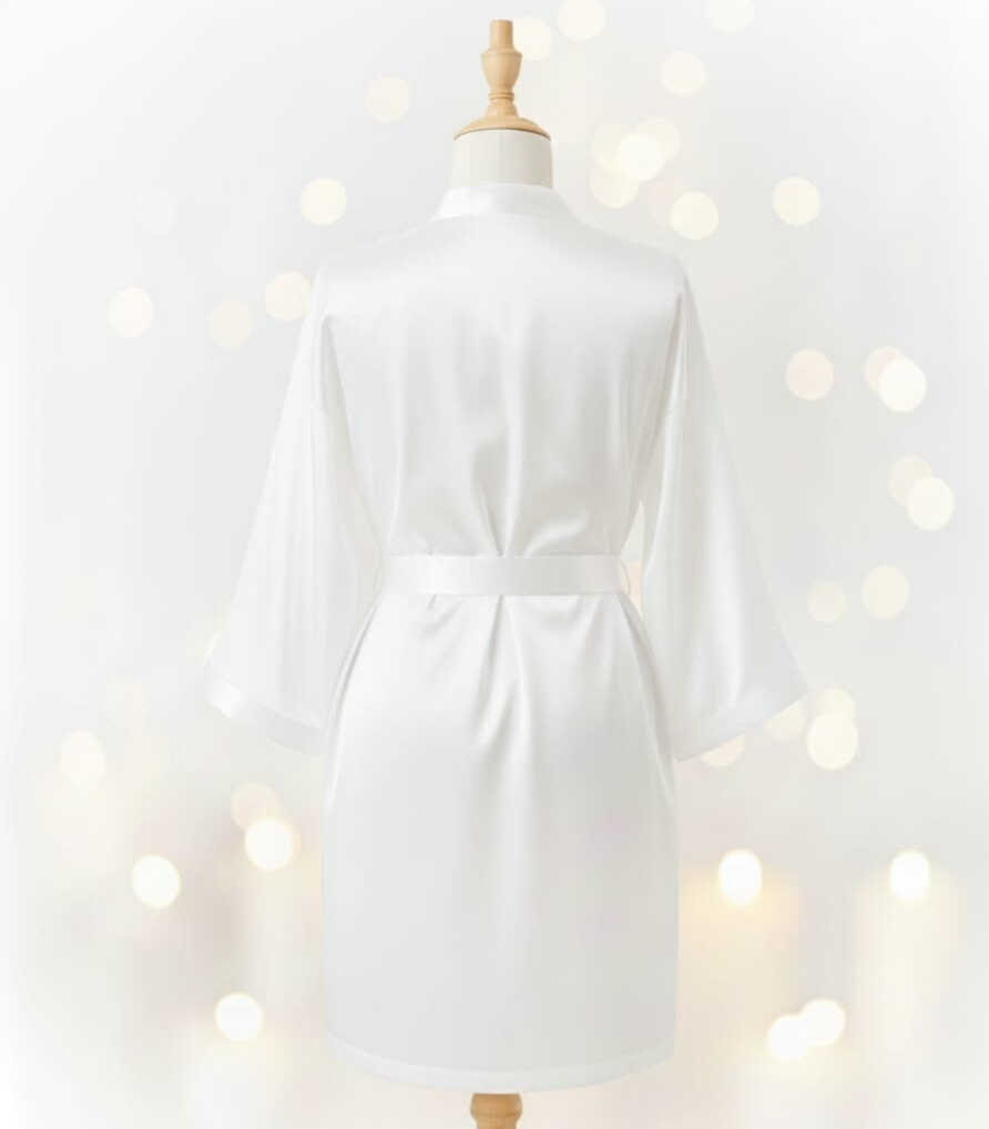 Esta bata lisa corta, confeccionada en satén de alto brillo color blanco puro, es la elección ideal para las novias que buscan elegancia y comodidad el día de su boda. Su diseño de corte kimono ofrece una silueta favorecedora y un tacto increíblemente suave, perfecta para las sesiones de fotos de "preparación".
