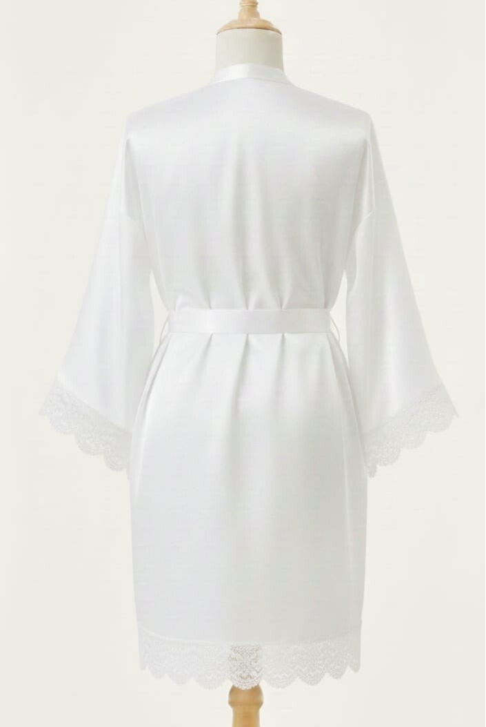 Esta bata de encaje está confeccionada en satén de alto brillo color blanco puro, es la elección ideal para las novias que buscan elegancia y comodidad el día de su boda. Su diseño de corte kimono ofrece una silueta favorecedora y un tacto increíblemente suave, perfecta para las sesiones de fotos de "preparación".
