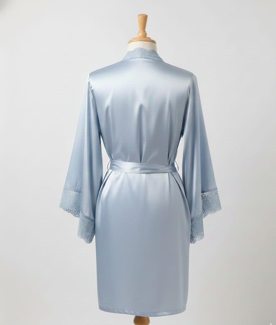 Esta bata corta, confeccionada en satén de alto brillo de color , es la elección ideal para las damas de honor o acompañantes que buscan elegancia y comodidad para acompañar a la novia en el día de su boda. Su diseño de corte kimono ofrece una silueta favorecedora y un tacto increíblemente suave, perfecta para las sesiones de fotos de "preparación".