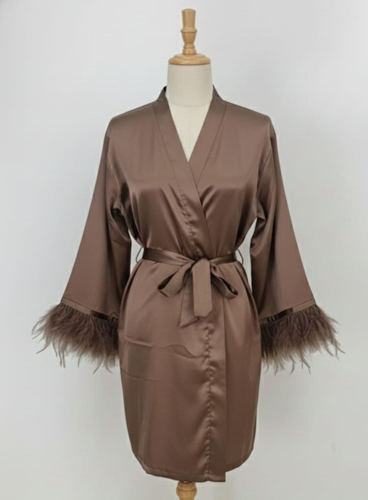 Esta bata corta, confeccionada en satén de alto brillo de color , es la elección ideal para las damas de honor o acompañantes que buscan elegancia y comodidad para acompañar a la novia en el día de su boda. Su diseño de corte kimono ofrece una silueta favorecedora y un tacto increíblemente suave, perfecta para las sesiones de fotos de "preparación".