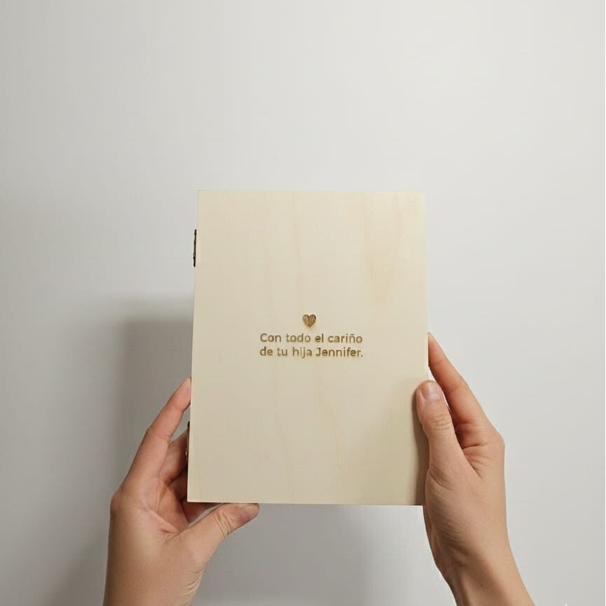 Marco de fotos de madera personalizado, de haya maciza, tipo libro, de 15*20cm (cerrado), con espacio para poner una fotografía de 13*18cm. Grabado en laser.